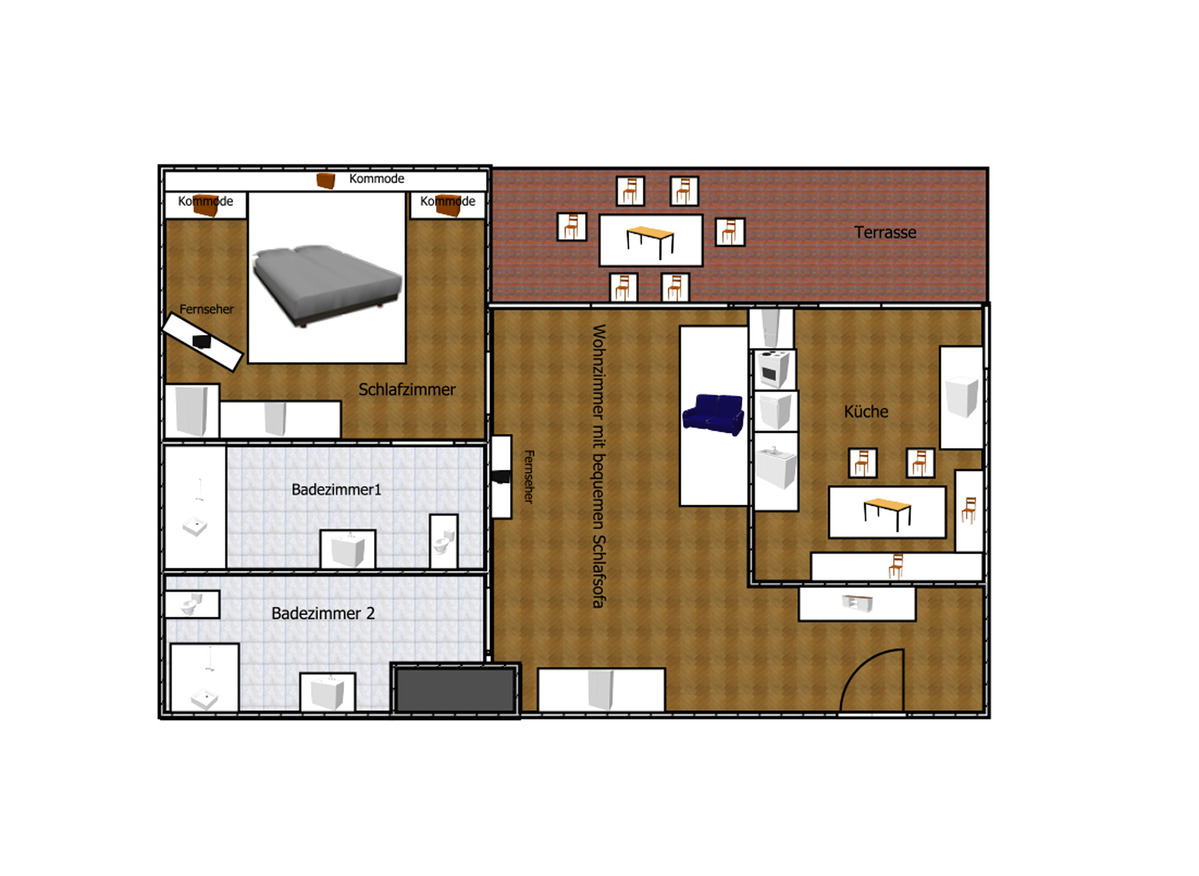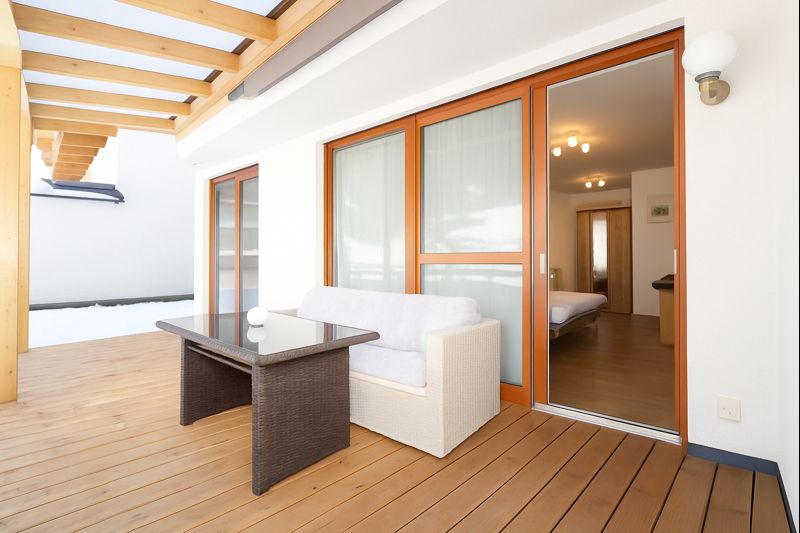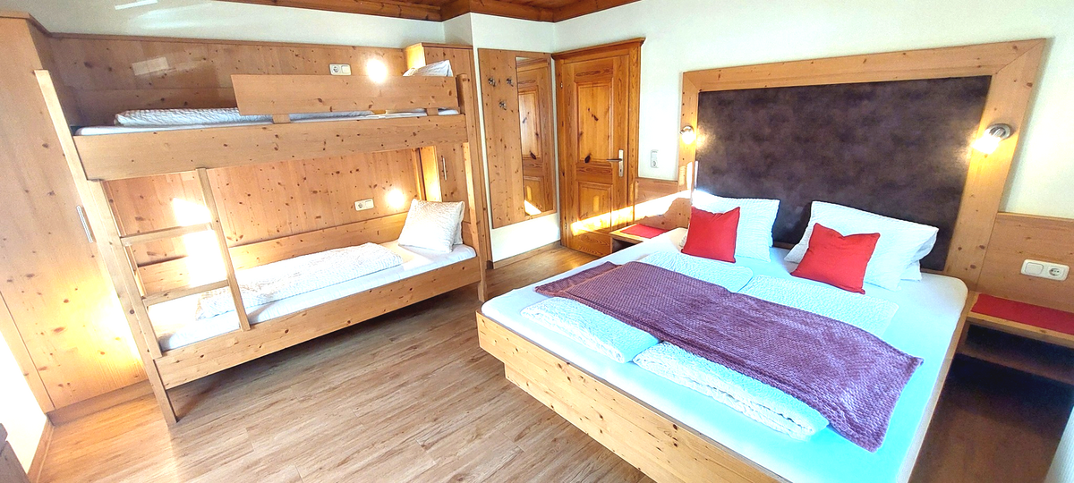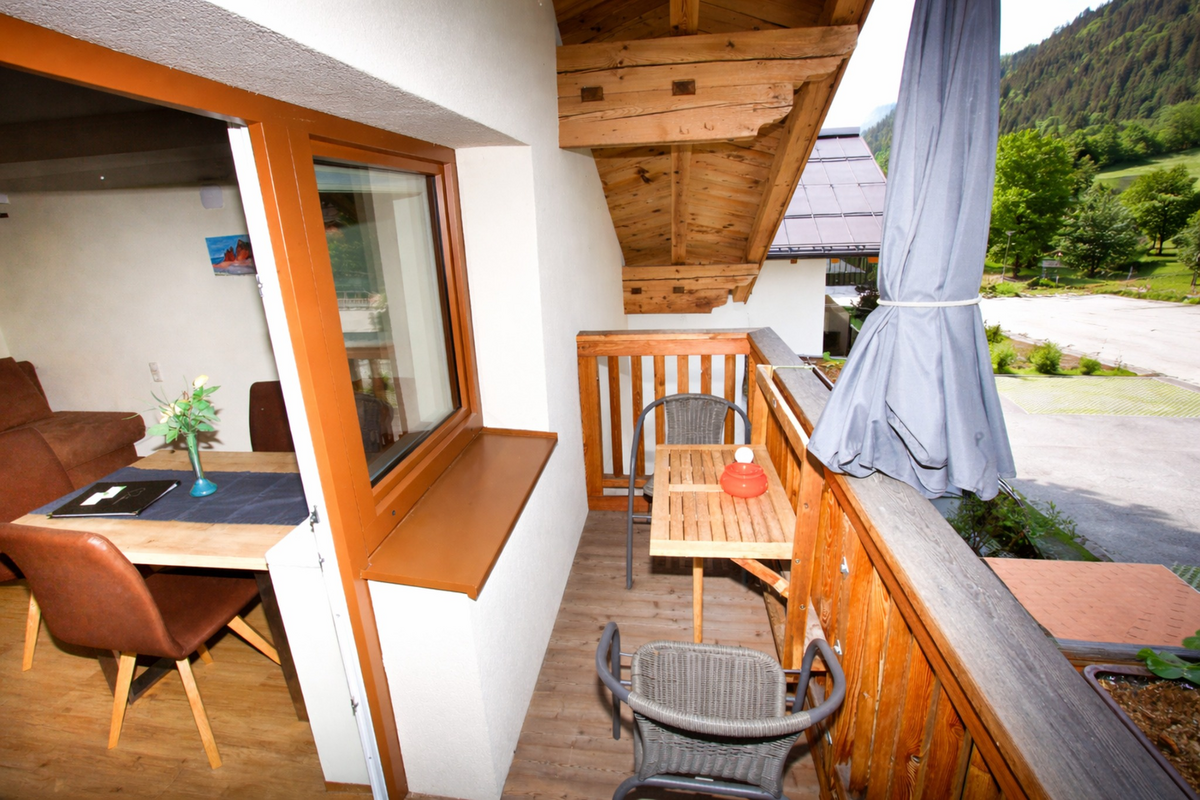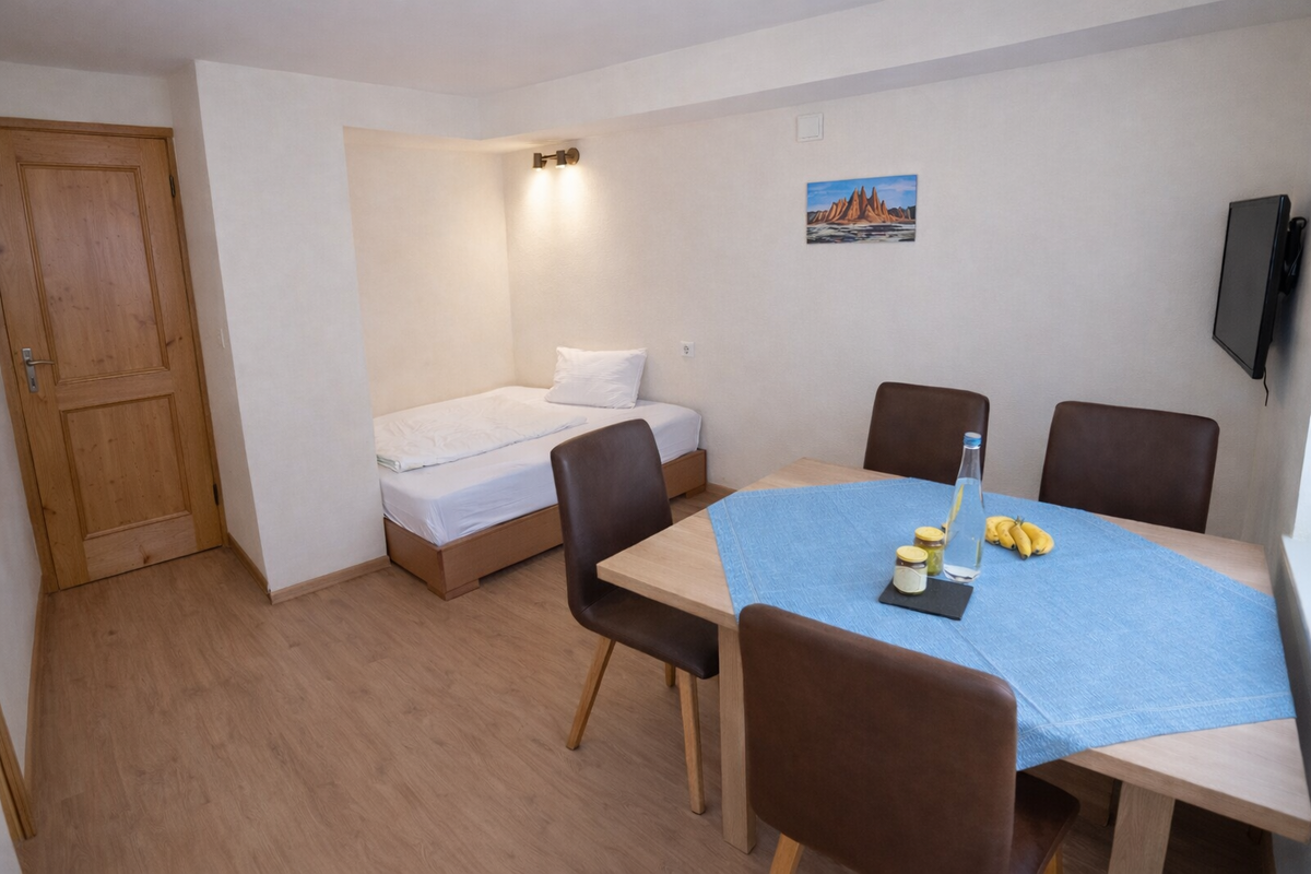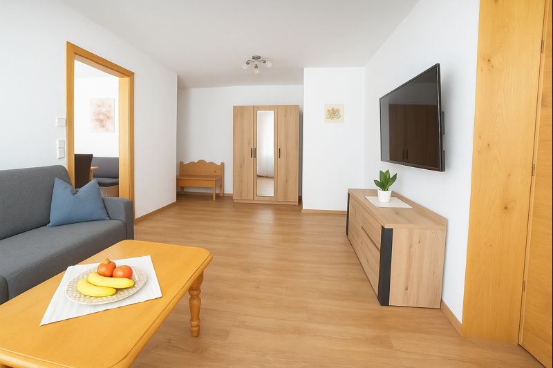 Our Liftblick apartment is located on the ground floor and features its own covered terrace of approx. 20 m². The apartment includes a bedroom with a double bed, a bathroom with shower and toilet, as well as a smart TV. In the spacious living area, you will find a comfortable sofa bed (W: 170 × L: 200 cm) with a smart TV and access to a private bathroom with shower and toilet. The sofa bed provides enough space for 2 adults or children to sleep.