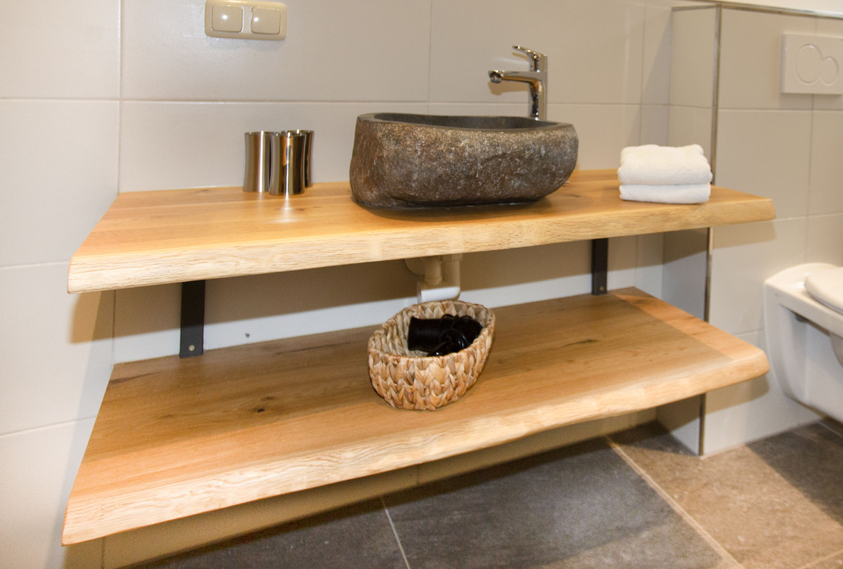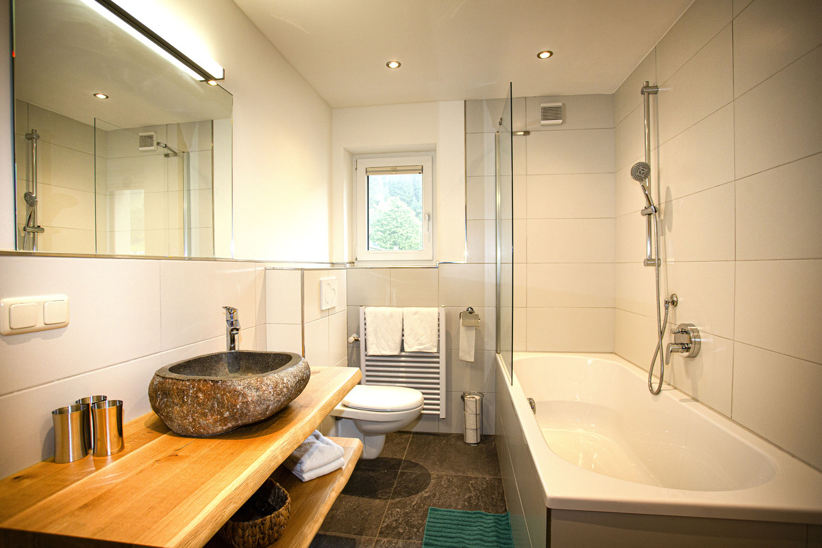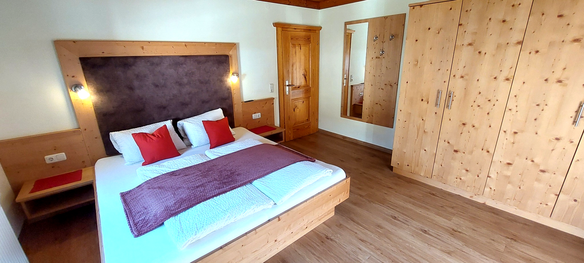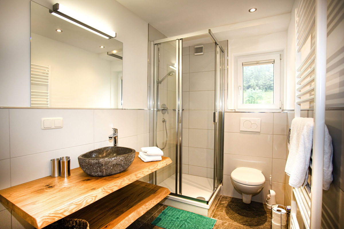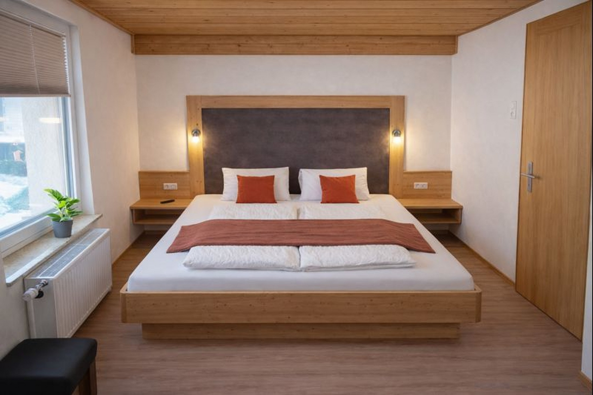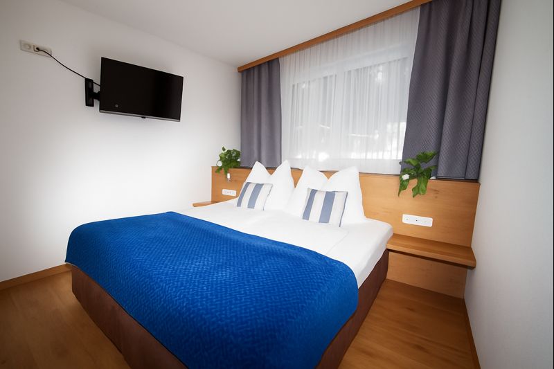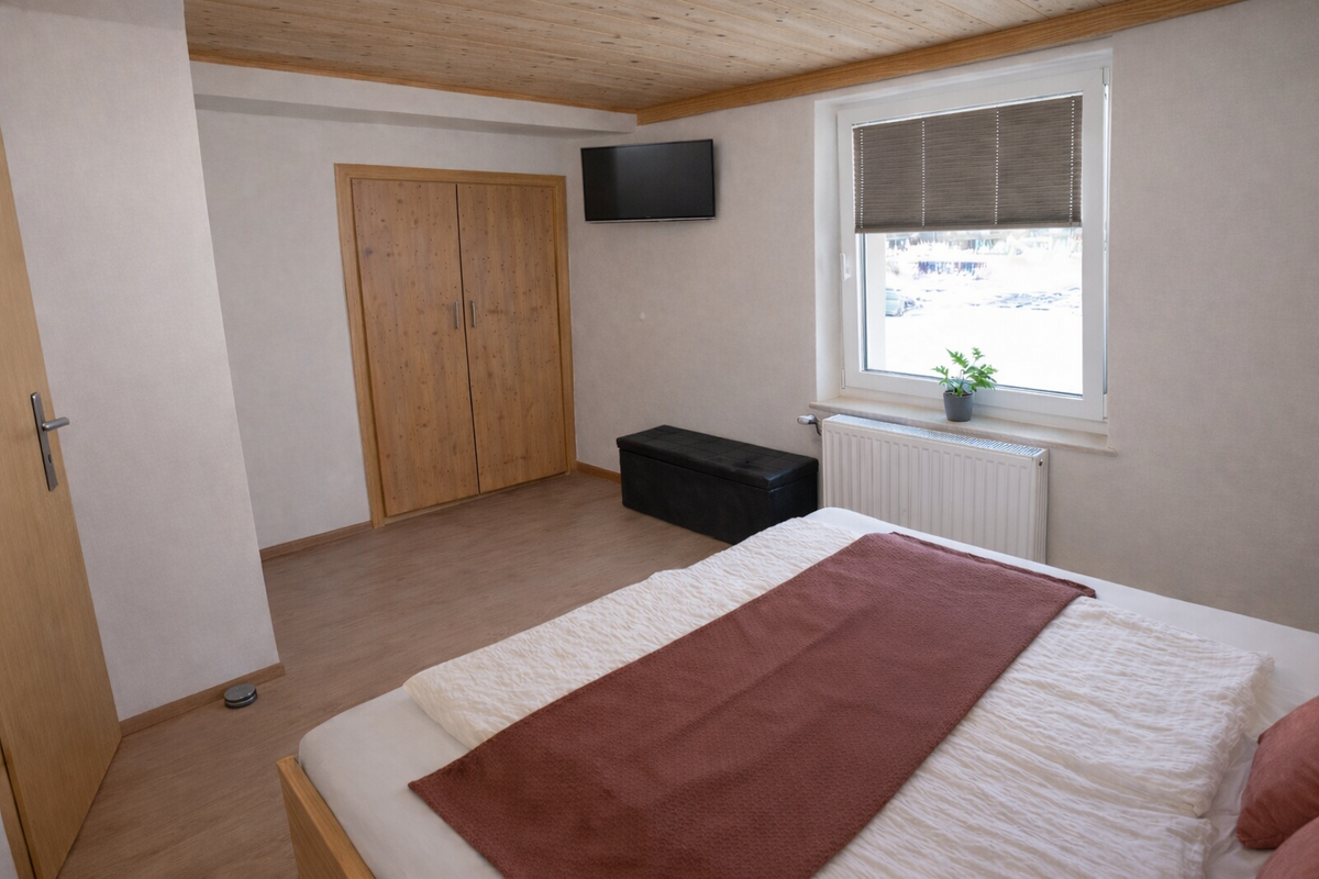 In our Palfenblick apartment with balcony there is 1 bedroom with a double bed (180×200). The bedroom is equipped with an 80 cm flat-screen TV. There is 1 bathroom with shower and toilet, which is accessible from the bedroom.