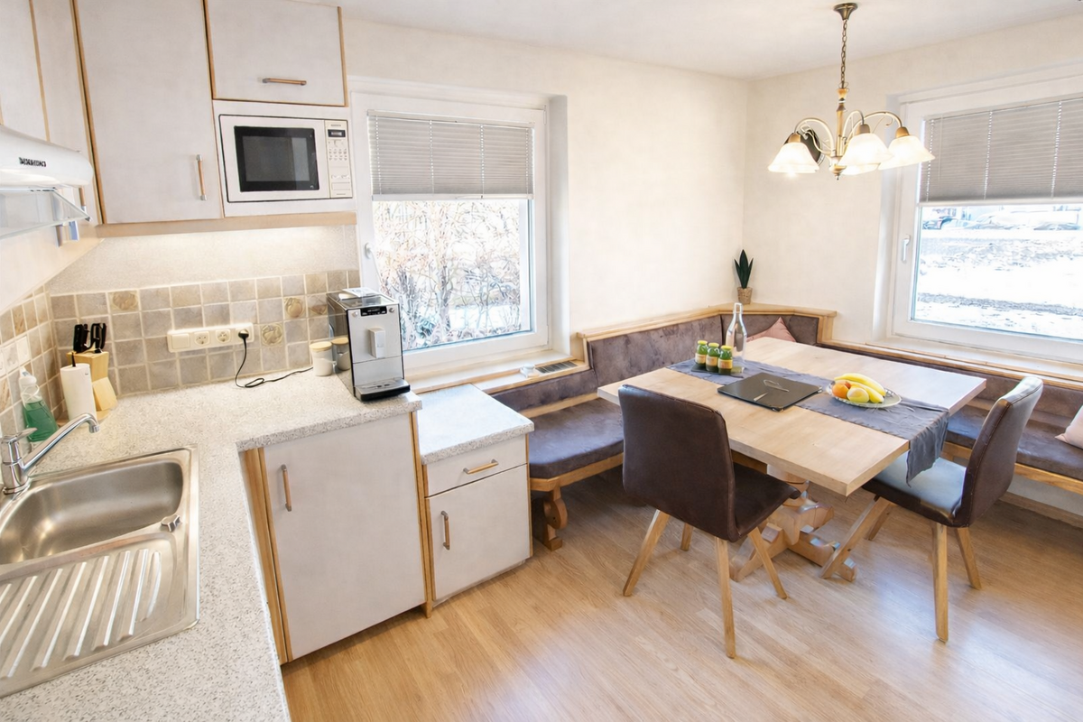 In the living room there is a cozy pull-out sofa (180×190) with a 143 cm smart TV and free Wi-Fi. In the kitchen you will find everything you need for your holiday, including a fully automatic coffee machine with enough coffee for the whole week. Bed linen is provided free of charge. We are happy to offer a bread delivery service right to your apartment door (bread rolls at an additional charge).